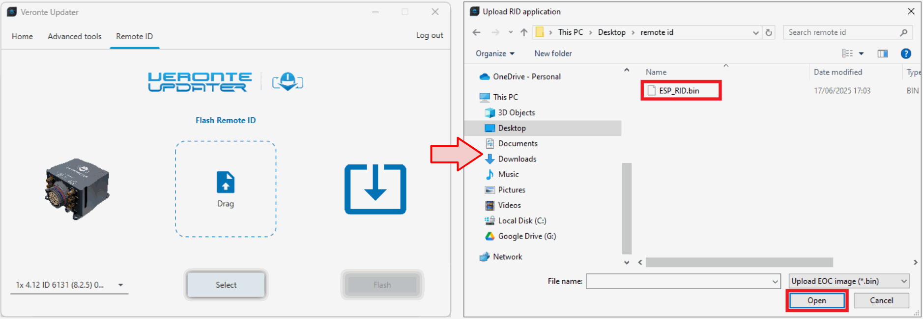 The latter option will open the following browser to select the .bin file stored in the user's local storage:
