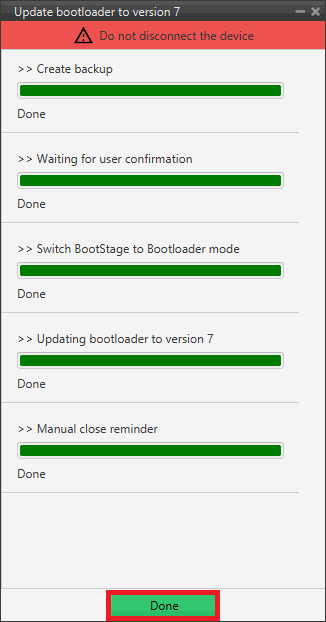 Once the Bootloader has been updated, the following message will appear with manual instructions: